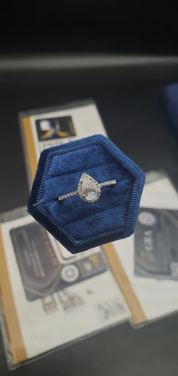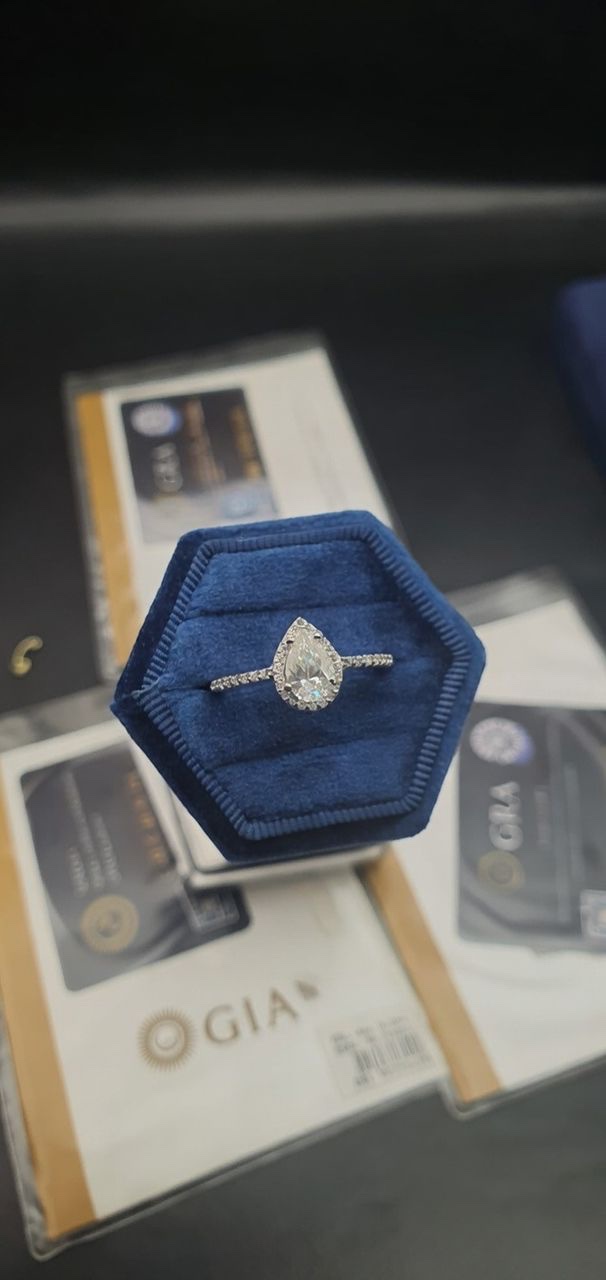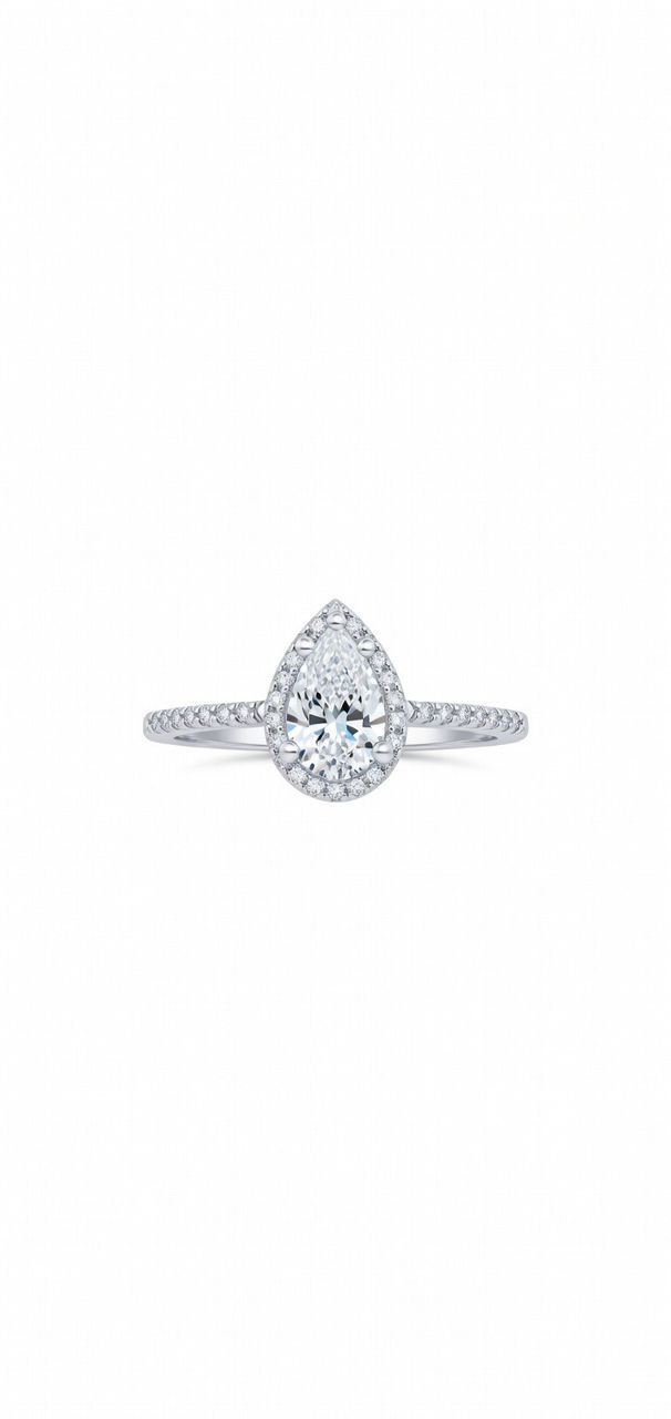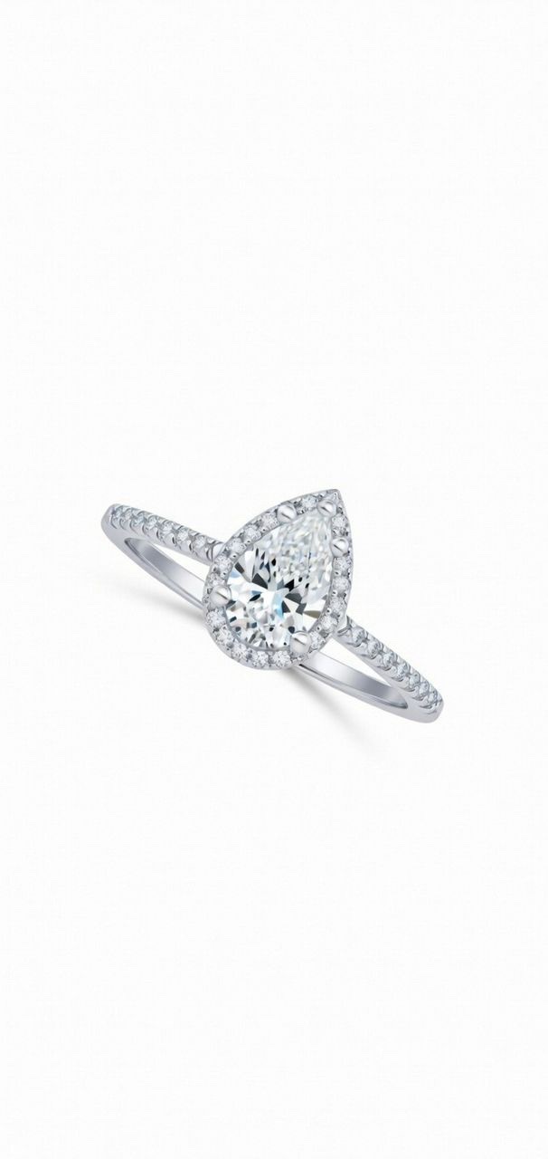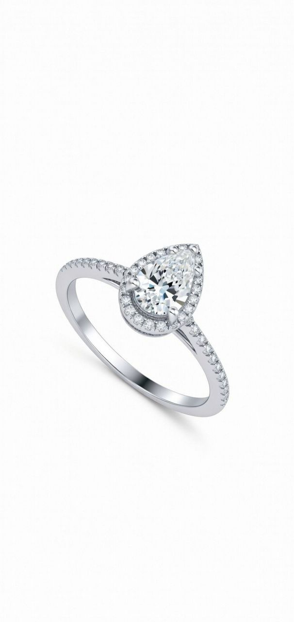 Pear cut Halo-set VVS Moissanite Engagement Ring.